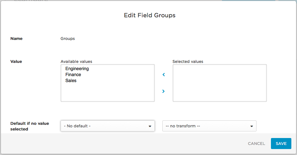 Groups: To provision users as members of particular LearnCore groups, you must first go to the Provisioning tab and click Refresh to import the available group values from LearnCore. These values then appear on the Edit Field Groups dialog when you click the Groups row: