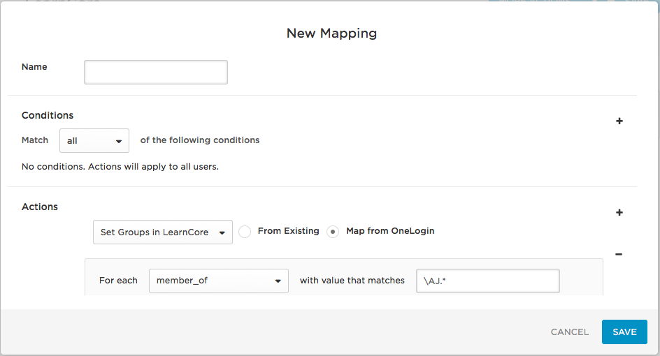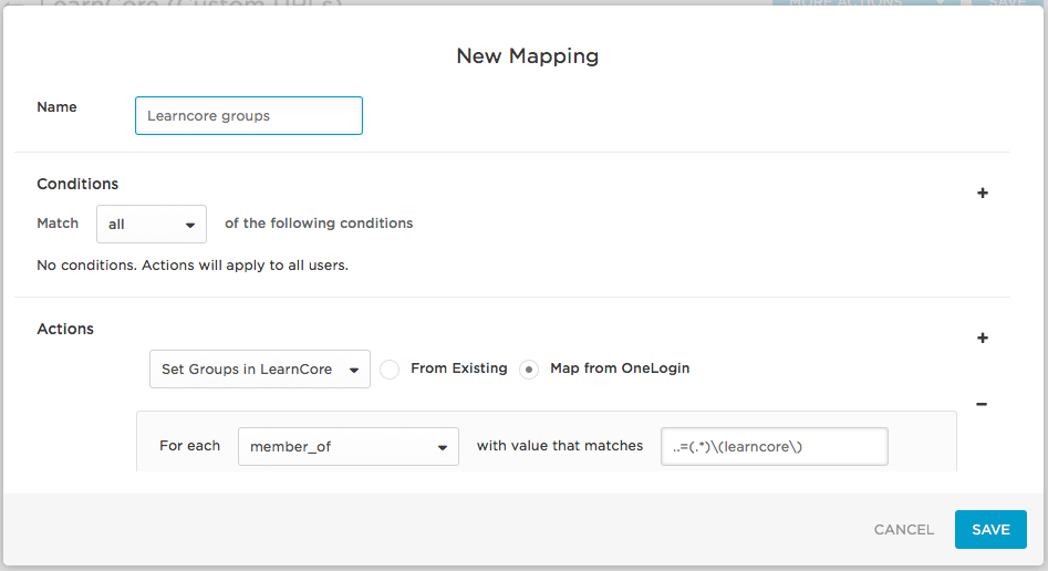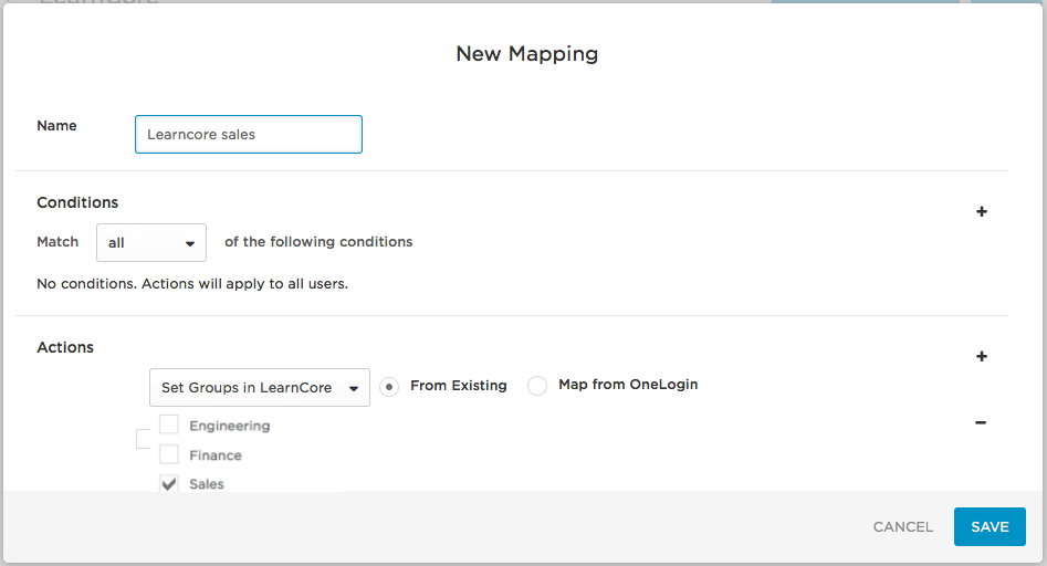 Click New rule to open the New Mapping dialog, where you can set the conditions and actions that determine which users will be provisioned from from OneLogin to specific LearnCore groups.