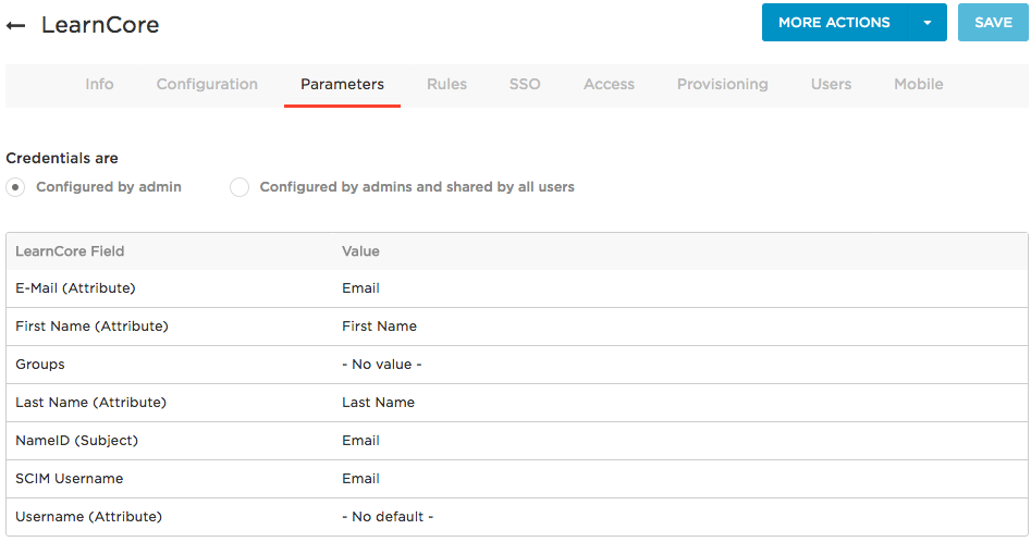 In this task, you map LearnCore user attributes to default OneLogin user attributes. These mappings tell OneLogin how to populate user attribute values to LearnCore when provisioning users from OneLogin. You can also use some of these parameters to create provisioning rules (in the next task).