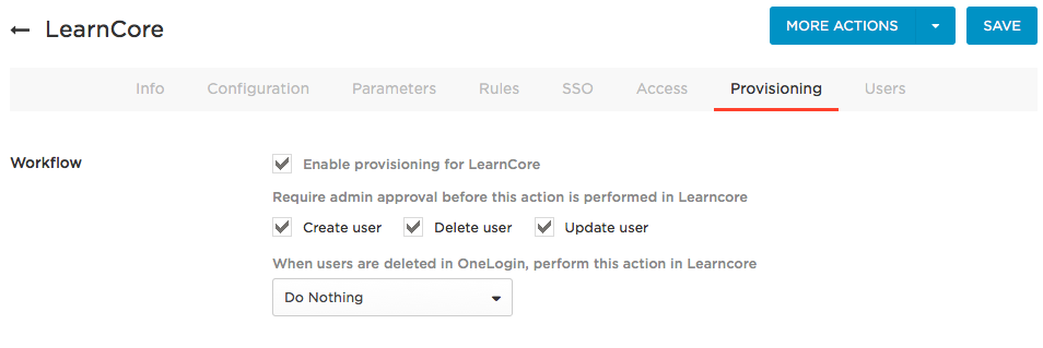 For any action you select, a OneLogin administrator must go to Users > Provisioning and manually approve each action for provisioning to complete. Clear these options if you want OneLogin to provision new users and user updates to LearnCore without administrative approval.