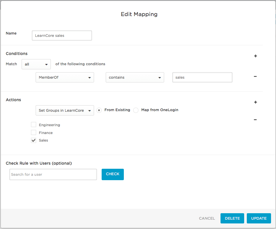 You can define rules to provision subsets of your OneLogin users into LearnCore groups. For example, you can define a subset of users by filtering on a specific OneLogin user attribute value and then define an action that provisions the subset of users to a specific LearnCore group.