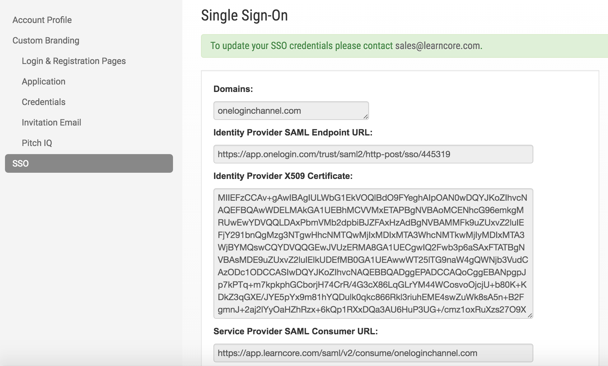 | SAML Consumer URL | The Service Provider SAML Consumer URL that you copied from LearnCore |