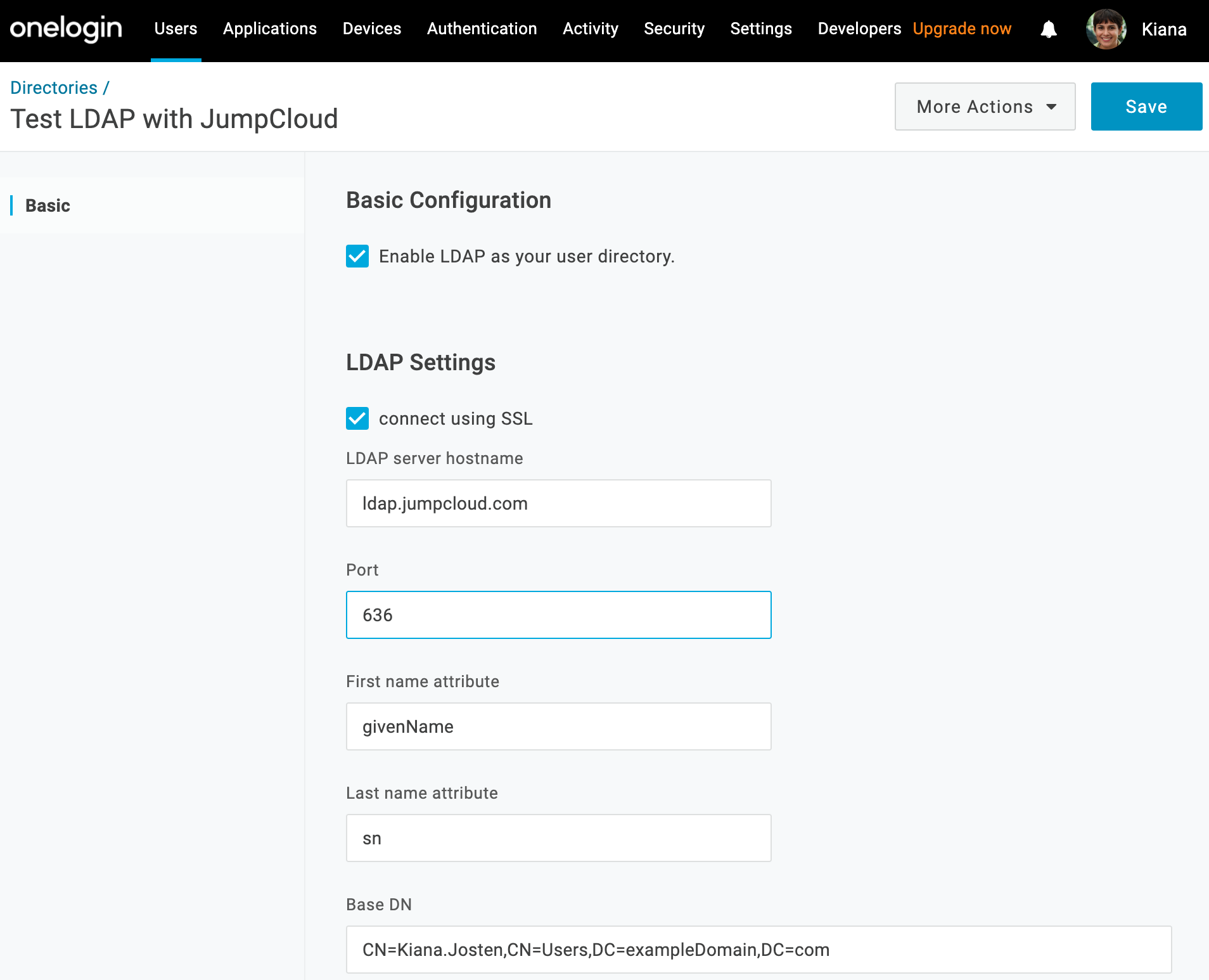 On the Basic tab, name your OneLogin directory connection, select Enable LDAP as your user directory, and select connect using SSL.