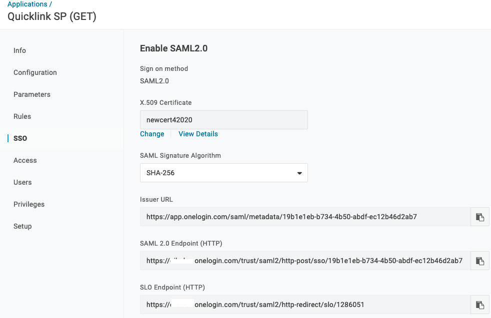- Navigate to the SSO tab and change the SAML Signature Algorithm to SHA-256. Click Save.