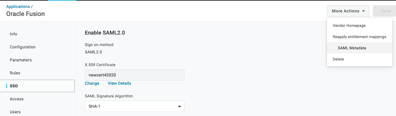- In the upper-right hand corner, click the More Actions menu and click SAML Metadata, then note where the file is saved so you can access it later.