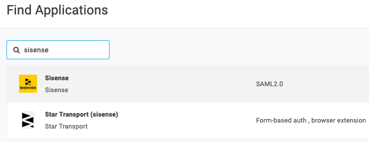 - Go to Administration > Applications > Applications, then click the Add App button, search for Sisense in the search box, and select Sisense. Click Save.