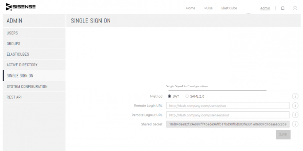 - Switch back to your Sisense administration panel, click Admin and select Single Sign On.