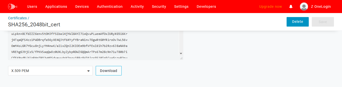 Identity Provider Certificate (required): The OneLogin X.509 PEM certificate you downloaded