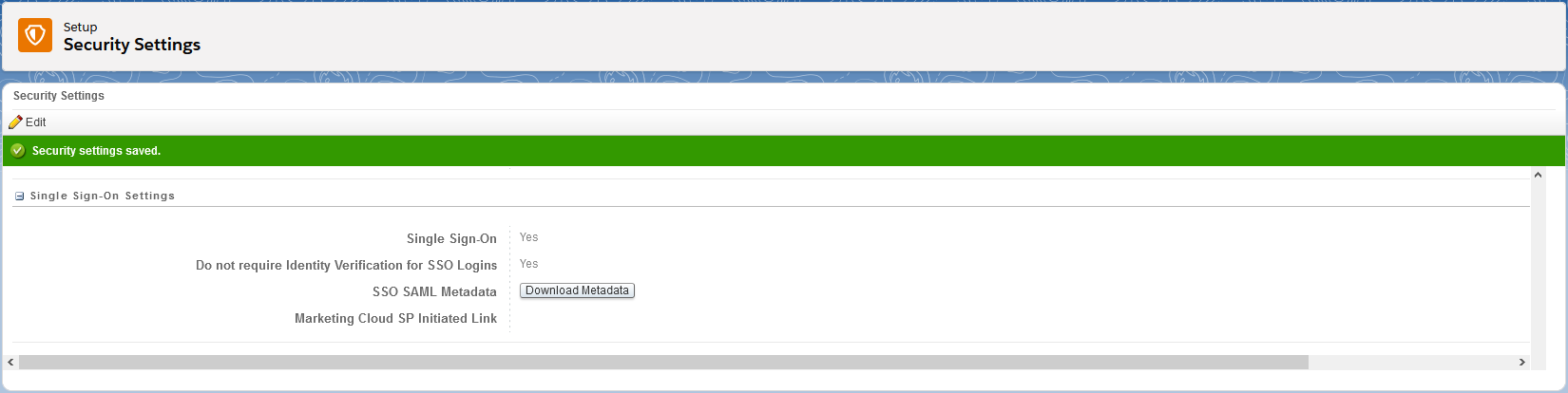 - Go to Settings > Security > Security Settings and click the Edit button. Under the Single Sign-On Settings section, configure the following: