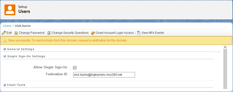 - Navigate to Administration > Users > Users > select/click a user to test with and configure the following.