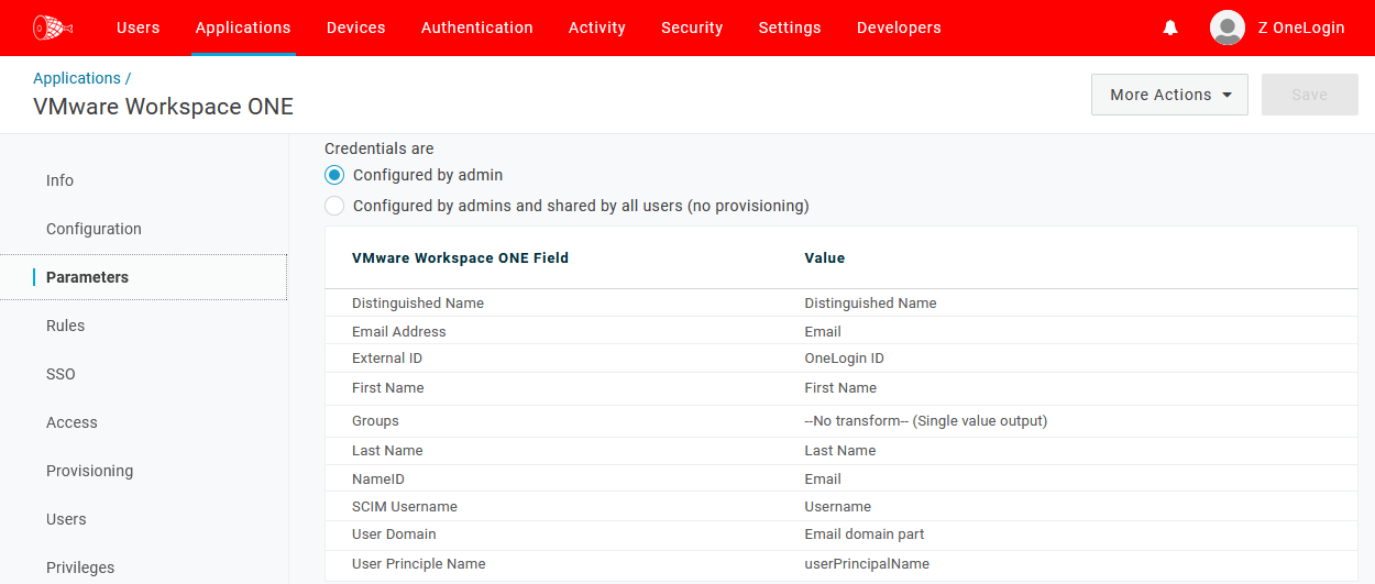 - Log into your OneLogin environment via a new tab, navigate to Administration > Applications > Applications, click the Add App button, search for and select VMware Workspace ONE, name the application, click Save, and configure your new SAML app.