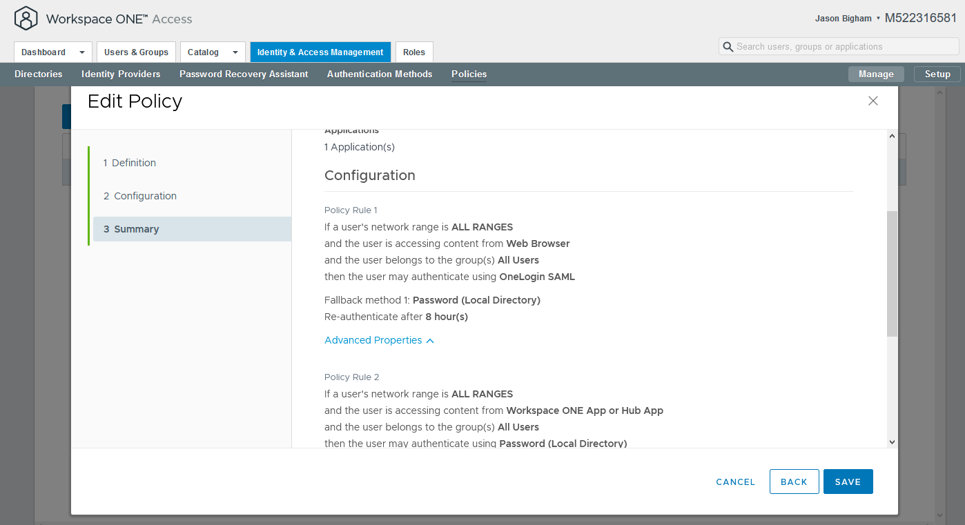 - Navigate to Workspace ONE Access > Identity & Access Management > Policies, select your relevant policy, and click the Edit button.