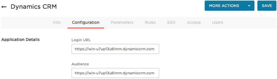 Go to the Configuration tab and enter your Dynamics CRM Login URL and Audience.